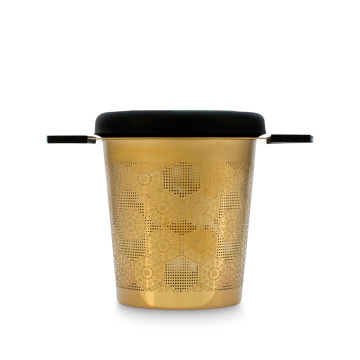 A stainless steel infuser with intricate etched print, silicone handles and matching drip tray.
