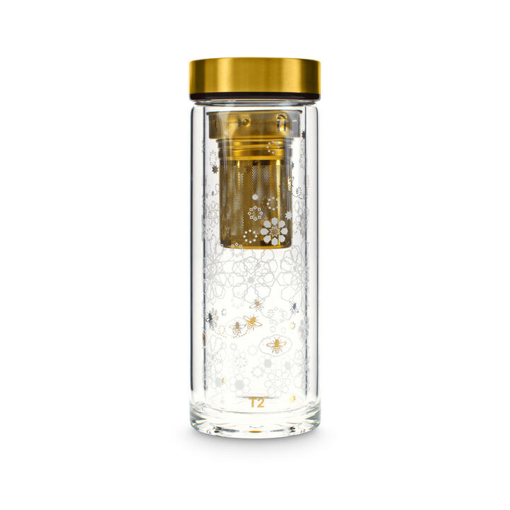 Double down on style and practicality with this double-walled glass flask — complete with gold lid and infuser plus beloved T2 bee design.
